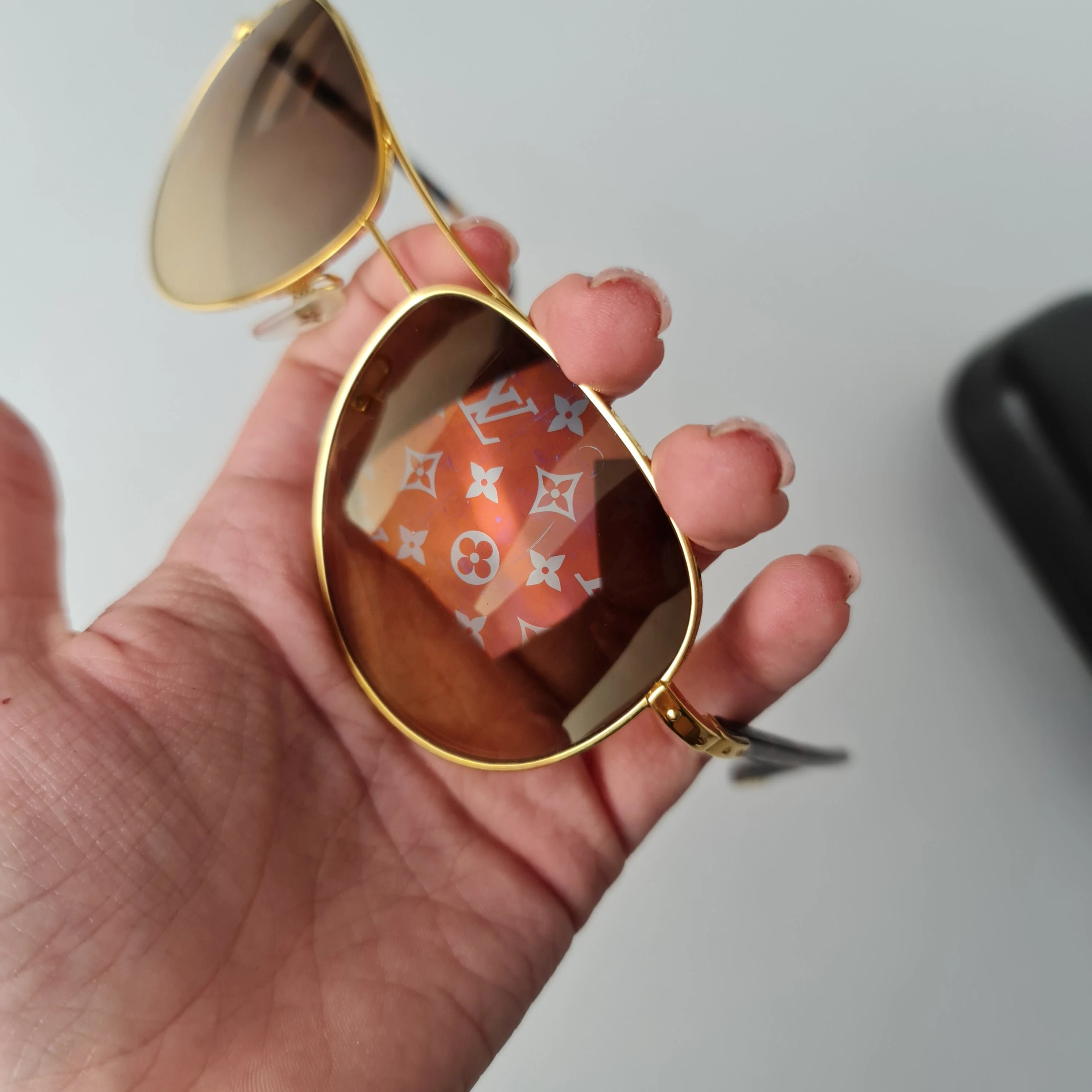 The Louis Vuitton Goldtone Frame Monogram Conspiration Pilote Sunglasses are perfect for both men and women. Their metal frames are engraved with the LV logo inspired by the edging of Louis Vuitton trunks and trunk corner details on the hinges. The lenses also feature the iconic LV monogram pattern and ensure 100% UV protection while maintaining a sense of style. Retail price is $705.